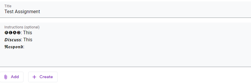 When you have a long set of instructions it is easy to get lost. Using bold and symbols allow you to call out specific information that can be lost. However, unfortunately Classroom does not allow you to do that. After some playing, I found a way to emphasize words. You can use tools like coolsymbol.com/cool-fancy-text-generator.html, you can type a word, phrase, or sentence. The site generates a variety of options using universal characters set that can be posted in your assignment. These options will allow you to make your assignment stand out from the rest of the post. Use fancy text to emphasize titles, due dates, names, project requirements, book titles—whatever you want to stand out in your post.